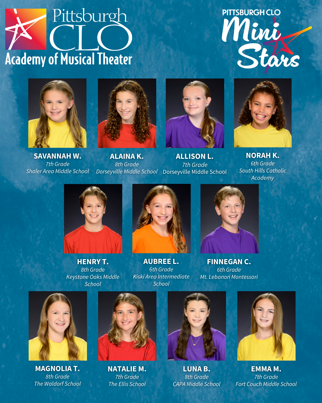 The Pittsburgh CLO Mini Stars, a hallmark of the organization’s legacy in cultivating young musical theater talent have returned to the Pittsburgh area to delight audiences and spread the joy of musical theater to your community! Students enrolled for a year at the Pittsburgh CLO Academy of Musical Theater will have the opportunity to audition for this elite performance group, known for dazzling audiences at community events, festivals, and showcases. Mini Stars alumni have gone to light up stages and screens and now a brand-new class of stars is ready to take the stage.